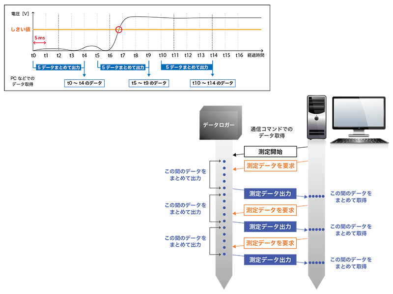 一般的にデータロガーで取得したデータを上位システムに転送するには、通信コマンドでやりとりします。一つのデータを取得するやりとりには数十msから数百msの時間がかかります。数msオーダーのサンプリングで測定したデータを上位システムが受け取るタイミングは、実際に測定したタイミングと大きなズレが生じます。図1は一般的なデータロガーの測定とデータ出力のタイミングを示しています。電圧値はt7より前にしきい値を超えていますが、t9のタイミングまでそのデータを取得することができません。また、数msの測定データを欠損なく上位システムが取得するには、複数のデータを一度に取得する必要があります。しかし、リアルタイムでデータを取得し演算結果をフィードバックするHILSでは、複数のデータをまとめて取得しても、使えるのは最新のデータだけになってしまいます。