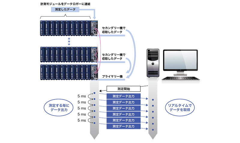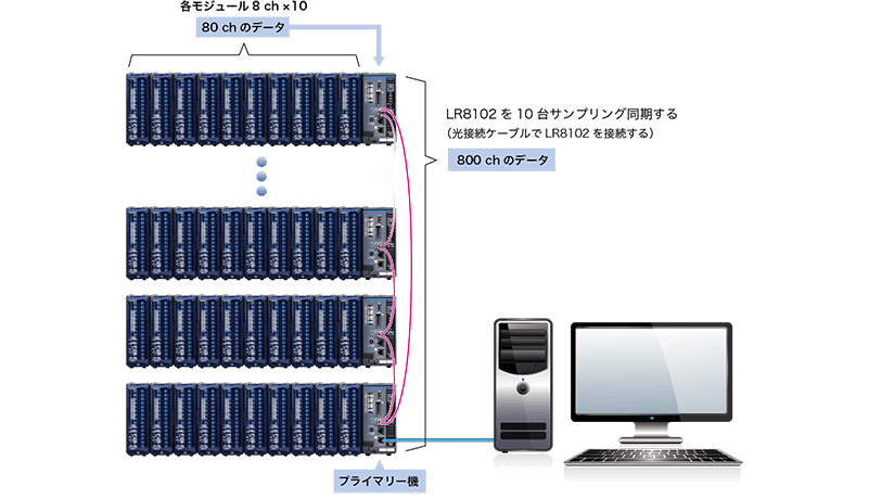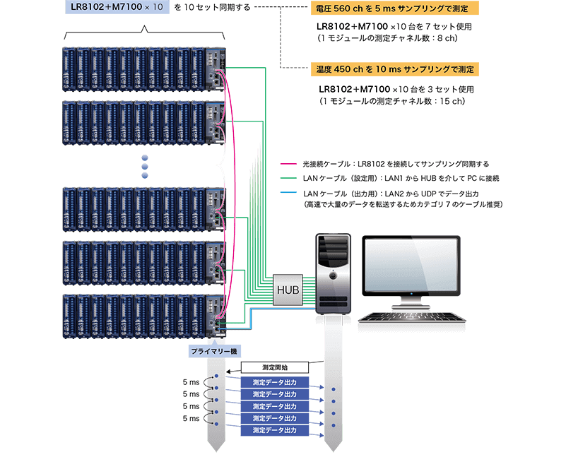 データロガーLR8102は、データロガー本体と測定モジュールを組み合わせることで入力チャネル数を自由に拡張できます。図3のようにM7100を10台連結したLR8102を光接続ケーブルで10台サンプリング同期すると、最大800 chを5 msサンプリングで測定できるシステムが構成できます。M7100で測定したデータは連結したLR8102で収集し、すべてのデータは5 ms以内にプライマリー機へ集約されます。集約されたデータはプライマリー機のデータ出力専用のLAN2ポートからリアルタイム高速出力されます。