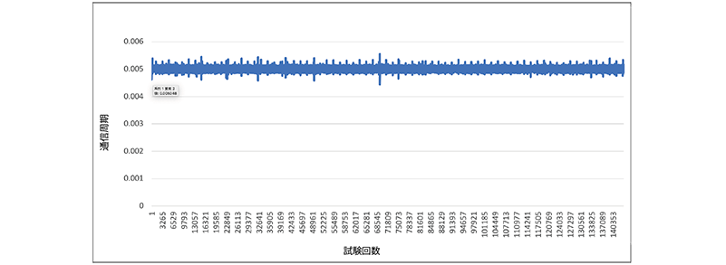 図2のグラフは、LR8102のUDP出力の通信周期の実証試験結果を示しています。5 ms毎に測定データをUDP出力し、遅延を観測しました。14万回を超えるプロットを繰り返しても、通信周期は5 ms ±600 µs以内と非常に安定していることがわかります。周期安定性が高いので、シミュレーションシステムにデータを高速出力しても安定した測定データを取得できます。