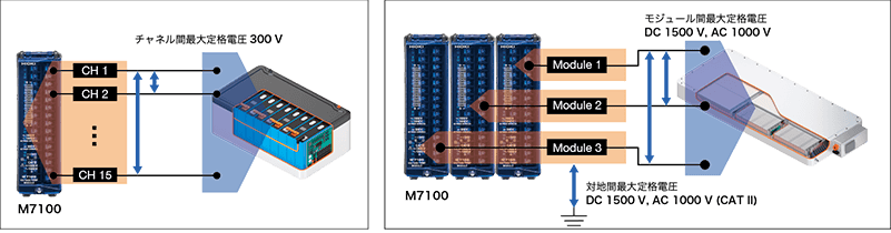 高電圧バッテリーパックのセル電圧を安全に測定するためには、高い絶縁性能が不可欠です。例えば、総電圧800 Vのバッテリーパックのセル電圧を測定するには、モジュール間電圧800 Vおよび対地間電圧800 Vの絶縁性能が必要です。電圧・温度モジュールM7100はEN IEC 61010 安全規格に準拠したDC 1500 V CAT IIの絶縁性能で、高電圧システムを安全に測定できます。