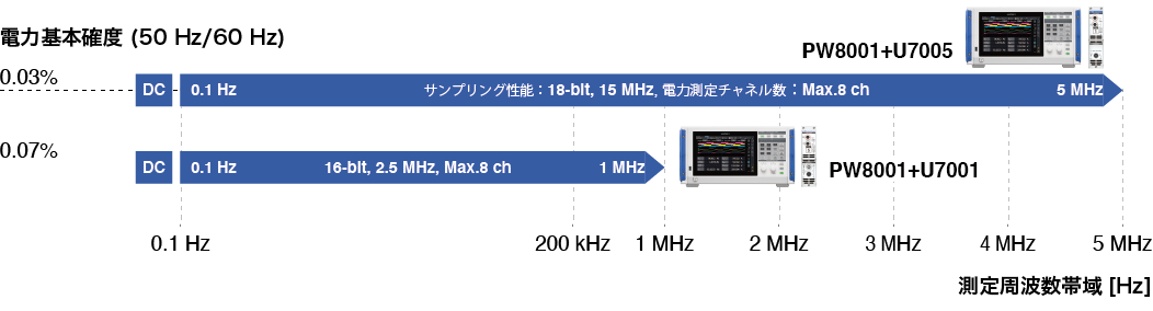 パワーアナライザPW8001は、測定用途に合わせて選べる2種類の入力ユニットと、定格2 A~2000 Aの幅広いラインアップの電流センサーに対応しています。必要となる測定確度と測定周波数帯域に応じて、2種類の入力ユニット混在で8チャネルまで搭載可能です。