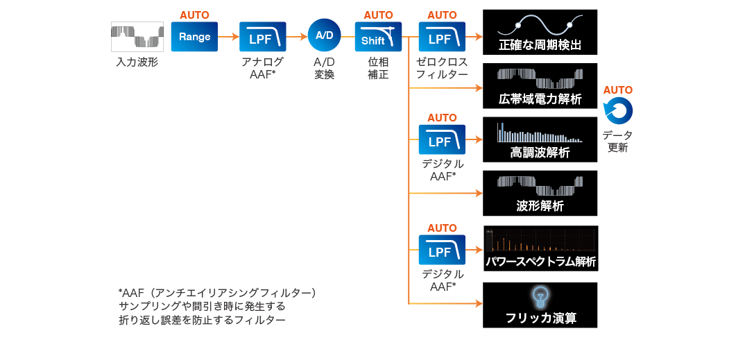 PW8001は正確な電力測定と、高調波やパワースペクトラム解析など全ての演算を同時並列に処理します。また、入力波形の大きさや周波数に応じて、測定レンジやフィルターの特性は内部で最適な状態に自動更新されます。これにより、一度の測定で全ての解析結果が正確に測定でき、多角的な検証が可能となります。