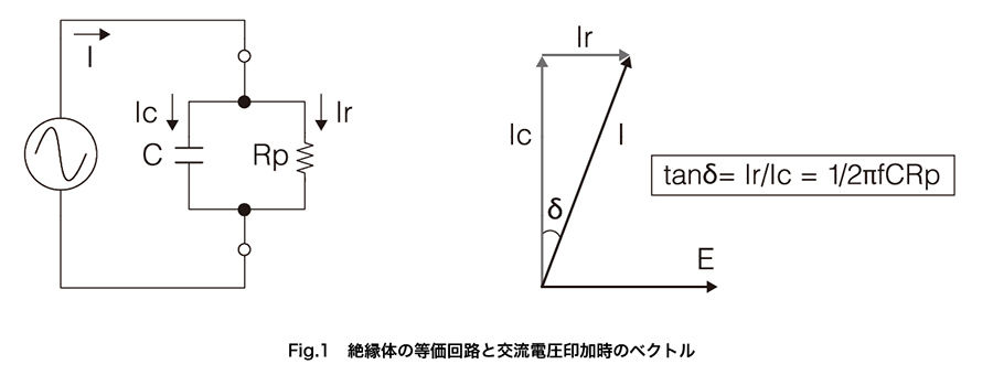 モーターのワニスの含浸状態の検査では、一般的に誘電正接計(tanδ計)が用いられます。誘電正接 tanδとは、電気絶縁材料の状態を数値で表す指標です。絶縁体(コイルと接地間)に交流電圧を印加すると、誘電損(または誘電損失)が起こります。tanδは、この誘電損の度合いです。