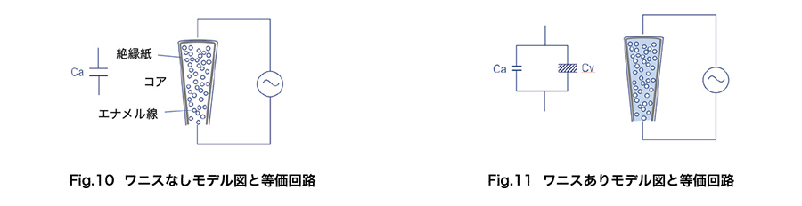 ・ワニスがない状態のモデル図と等価回路 (Fig.10) ではコアとコイルが電極となり、空気と絶縁紙で絶縁されています。