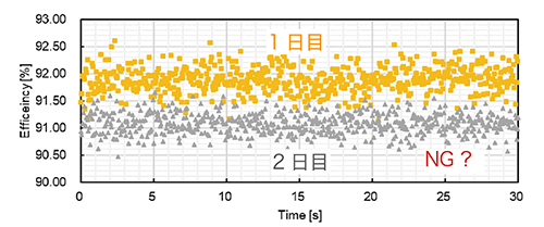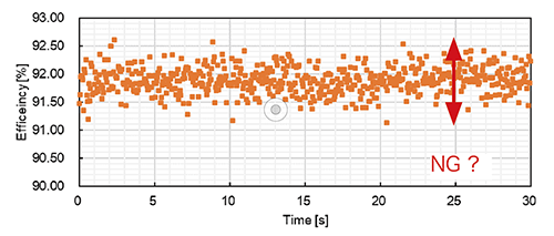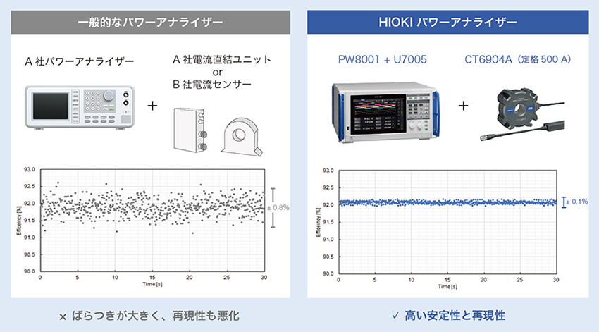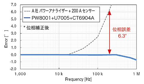 HIOKI のパワーアナライザーは、専用電流センサーをラインナップし、共に自社開発だからこそ本体と電流センサーとのマッチングを考慮した設計により高精度測定ができます。インバーターの効率改善の追求には、高周波電力を高精度に測定する必要があり、特性を把握した位相補正により正確性、再現性など、安定した測定を実現します。