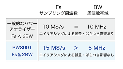 15 MHzの高速A/Dコンバーターを採用することで、5 MHzの広帯域測定とエイリアシングの防止を両立している。