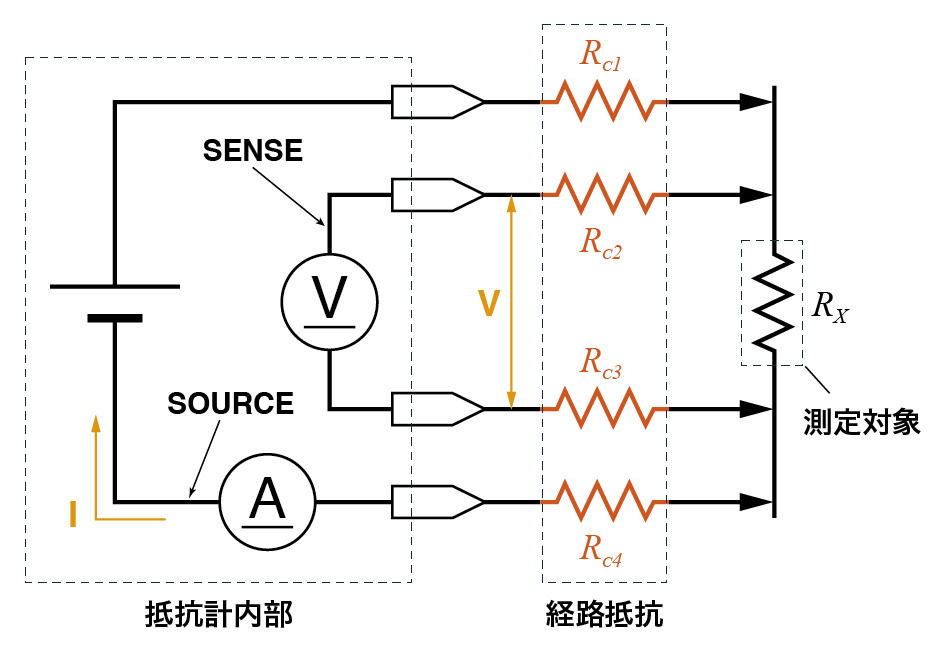 HIOKIの抵抗計RMシリーズでは、定電流方式を採用しています。測定対象(DUT)にSOURCE(電流印加ライン)から一定の電流(I)を流し、SENSE(電圧検出ライン)で電圧(V)を検出します。オームの法則(R=V/I)に基づき、抵抗値を算出します。4端子測定(ケルビン測定法)は、電流印加経路と電圧検出経路を分離することで、経路抵抗=配線抵抗+接触抵抗の影響を排除できるため、低抵抗測定において信頼性の高い結果を提供します。「抵抗測定の手引き」の8ページから9ページも併せて参照してください。 ここでは、4端子測定を前提に、プロービングのポイントを詳しく解説します。