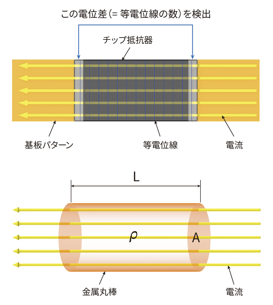 ここでは、チップ抵抗器(面実装抵抗器)と金属丸棒を例に挙げ、理想状態と実測時の測定電流の流れ方と測定値に与える影響について詳しく見ていきましょう。