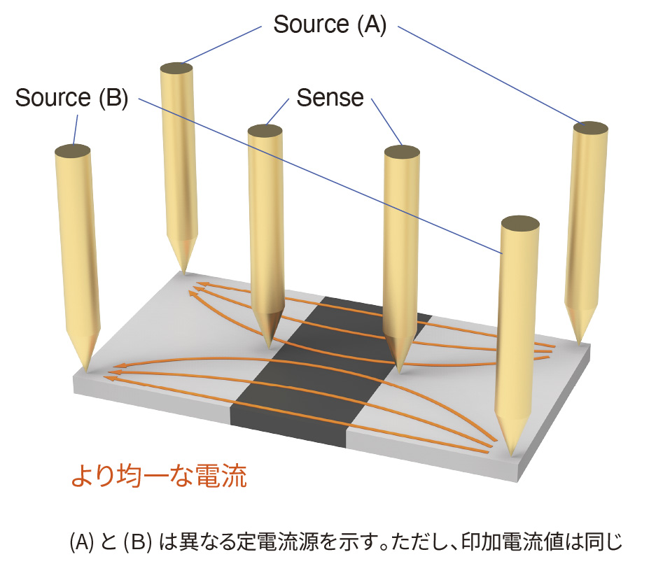 一般的にはDUTの幅・厚みの3倍以上SENSE-SOURCE間距離を離すことが理想とされています。この場合、一様な電流の部分を計測することができ、「仕様値・理論値と測定値のずれ」や「プロービングごとの測定値のばらつき」を抑えることができます。