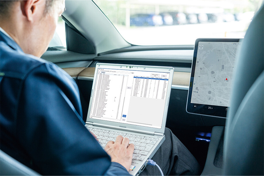 図9 車内のノートPCでリアルタイムのテストデータを確認するエンジニア