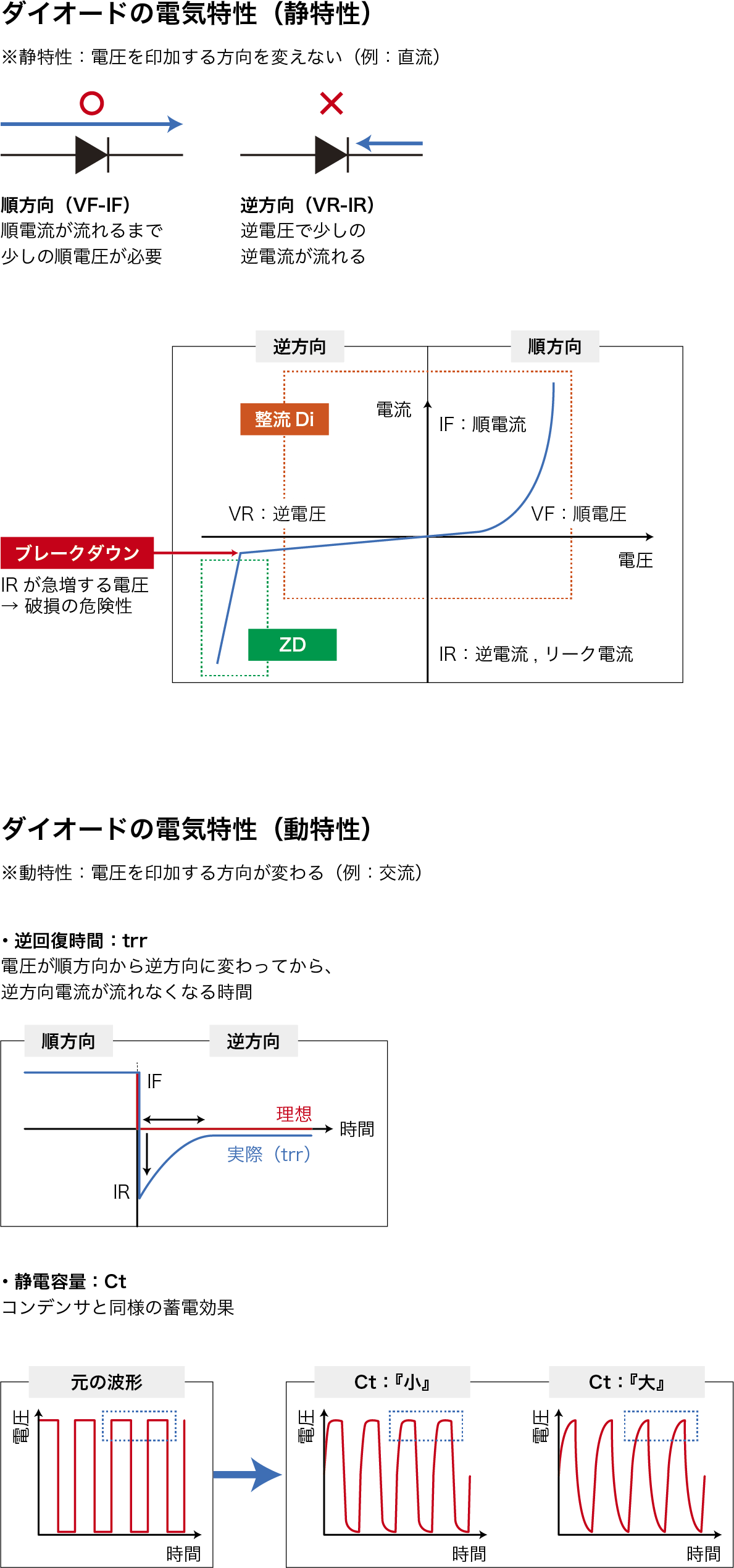 代表的な半導体である、FETやダイオードはp型半導体とn型半導体が一つの結晶内でつながったPN接合という構造で形成されています。ダイオードは、ひとつのPN接合、FETはpnpまたは、npnとふたつのPN接合で形成されています。PN接合の面にかかる電圧がある値より大きくなると電子の流れが発生します。この性質を利用し、電圧の大きさで電気信号のON/OFFを制御します。素早くON/OFFする為に、電圧を高速に変化させる必要があります。そのため、数pFと低い容量であることが求められます。