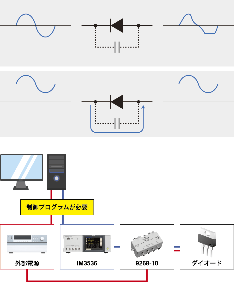 LCRメーターの測定信号はゼロを中心とした正弦波です。半導体にゼロを中心とした正弦波を加えると、プラス側は流れ、マイナス側は流れない半導体の特性から、測定信号が歪みます。そのため、直流電源から半導体にバイアス直流電圧をかけ、LCRメーターで容量を測定します。さらに、直流電圧を変えながら容量測定したものが「CV特性」です。しかし、LCRメーターと直流電源を組み合わせた測定には、各機器を統合して制御するプログラム構築が必要になります。