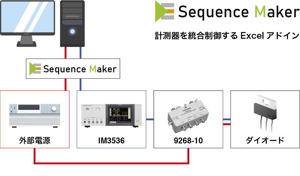 “Sequence Maker”は計測器を統合制御するExcelアドインです。USB、RS232C、LAN、GPIBといった通信インターフェースに対応しています。また、計測器の通信共通ドライバであるVISAにも対応しています。PCにつながった計測器を自動でサーチし通信を確立してくれるので、制御コマンドを制御したい順番でExcel上に記載していけば思い通りの制御ができます。