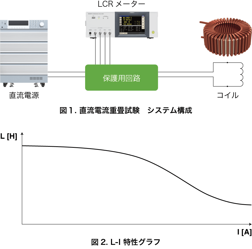 コイルの直流電流重畳試験(DC 電流バイアス試験)は、直流電源とLCR メータ、保護用回路で構成されます(図1)。試験は直流電源の電流をスイープさせながら、LCR メータによりインダクタンス値を記録します。記録したデータから「L-I 特性グラフ」を描きます(図2)。保護用回路は直流電源で発生させる最大電流や測定周波数などにより、計測器メーカーが用意しているもの、もしくは要求仕様に合わせて製作することになります。直流電流重畳試験システムを扱うメーカーもありますが、200A から300A が最大で、それ以上の電流値の試験はできません。