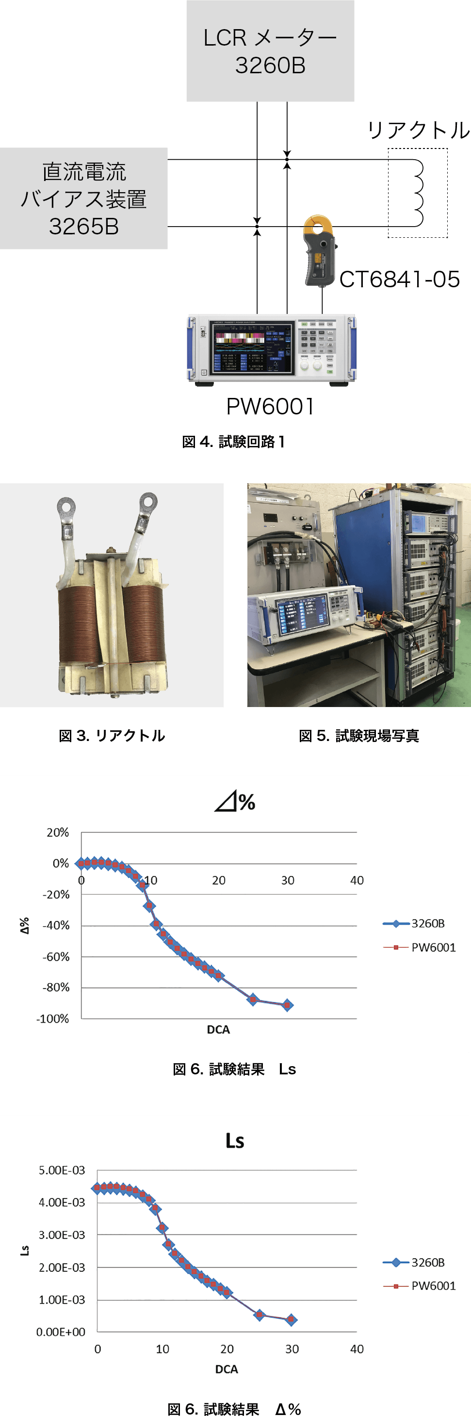 4 mH のリアクトルを用意し(図3)、Wayne Kerr 社製 直流バイアス試験セットで、測定周波数を1 kHz, 0 A から30 A までインダクタンス値を記録しました。また同時に日置電機製のパワーアナライザ PW6001 を用い、バイアス装置のDC に重畳したLCR メータの測定AC 電圧と測定AC 電流の値と位相角の計測値からインダクタンス値を求める演算式を内部に設定し、インダクタンス値を測定しました(図4)(図5)。