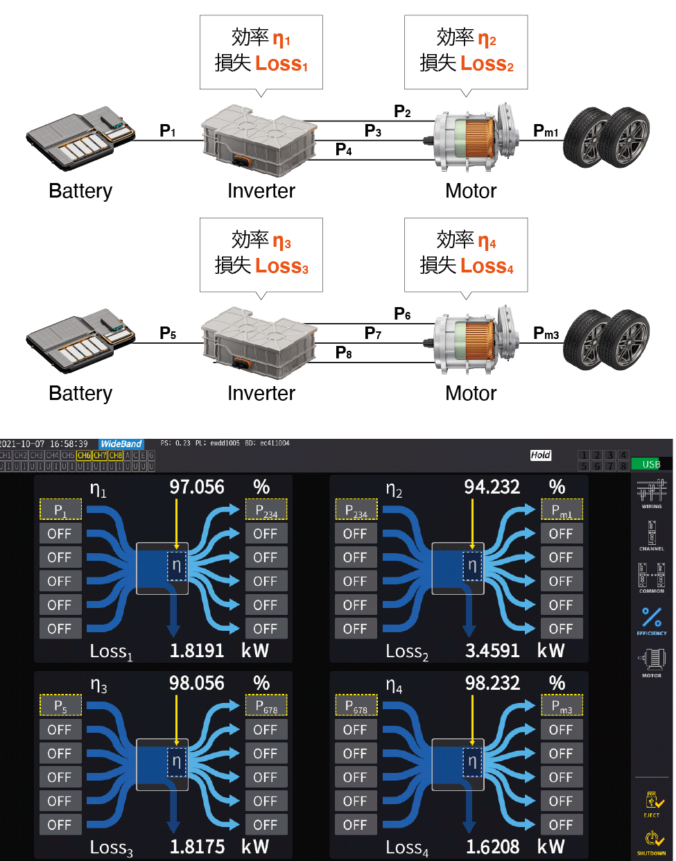 パワーアナライザPW8001-11(モーター解析機能付き)と電流センサーを使用して、フロントとリア2 つのモーターパワーと各モーターに付随する2つのインバーターへの電力入出力を測定し、それぞれの電力変換効率と損失を測定しました。