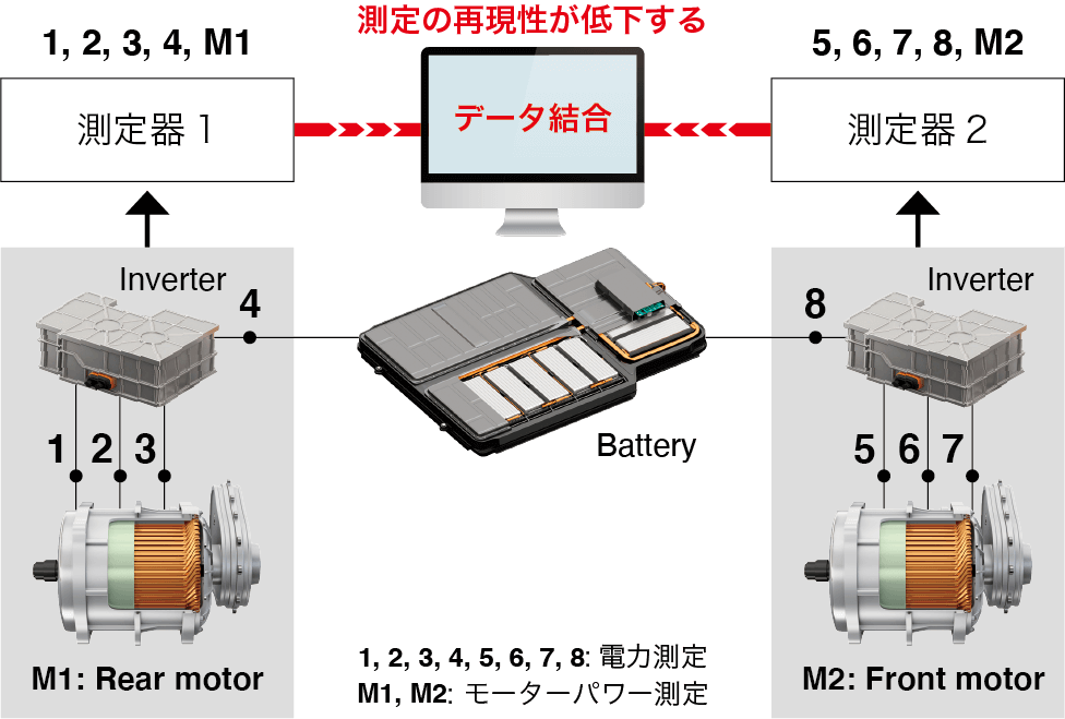 デュアルモーターAWD では、フロントとリアの連動が重要です。性能評価では、「フロントとリヤのモーターパワー」、「各モーターに付随するインバーターへの電力入出力」を全て同じ時系列で測定し、電力の変換効率と損失を算出します。しかし、測定チャネル数が不足する場合、複数台の測定器を使用します。しかし、この場合、測定結果を後から結合する必要があり、解析に手間を要し、測定の再現性が損なわれます。
