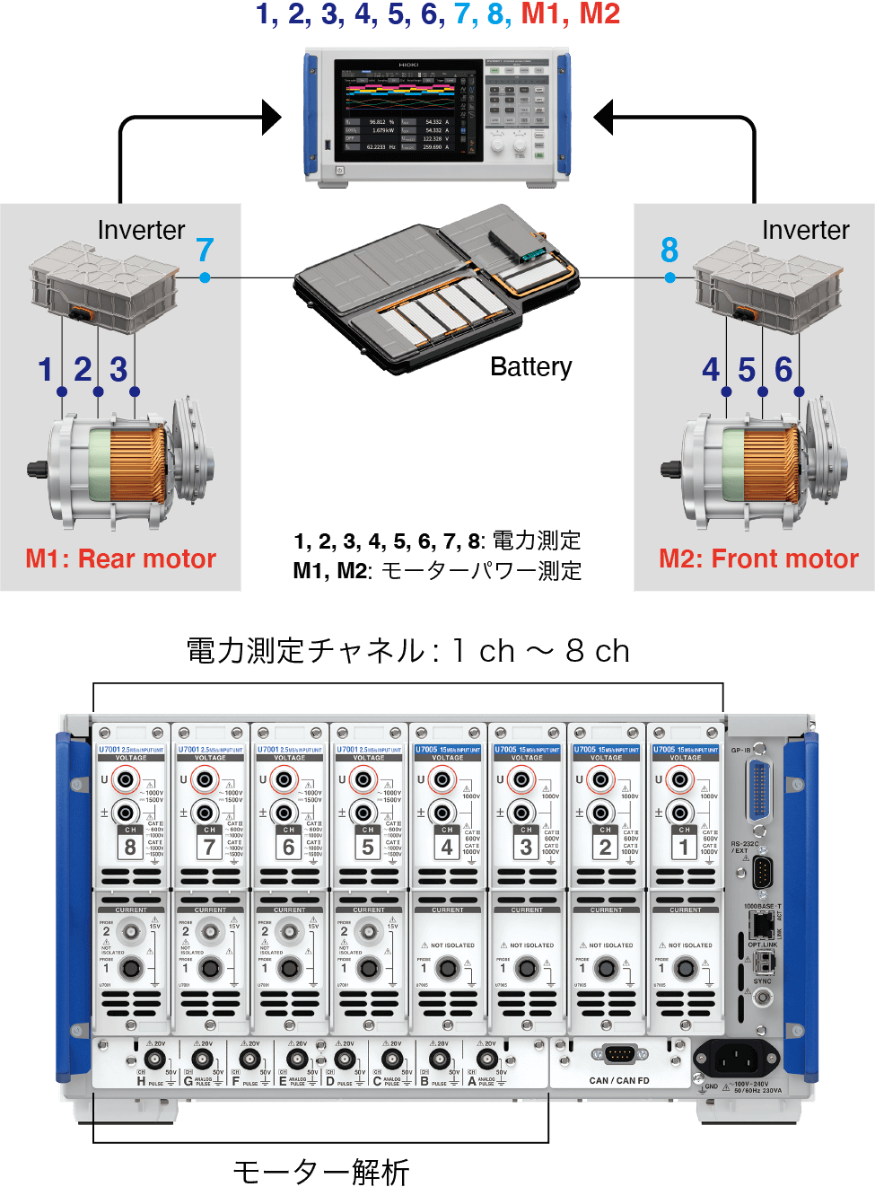 パワーアナライザPW8001 は、1 台で8 ch の電力と2 つのモーターパワー(2 系統のトルクと2 系統のエンコーダ出力)を同時に測定できます。デュアルモーターAWD の性能を効率的かつ高い再現性で測定できます。