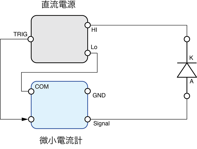 PDやAPDの主要な電気特性のひとつであるI-V特性は、直流電圧源と微小電流計を用いた計測が一般的な方法です。しかし、この2種類の使い分けが煩わしいだけでなく、機器間の配線が複雑になるため、ノイズの影響により測定精度が低くなる場合があります。