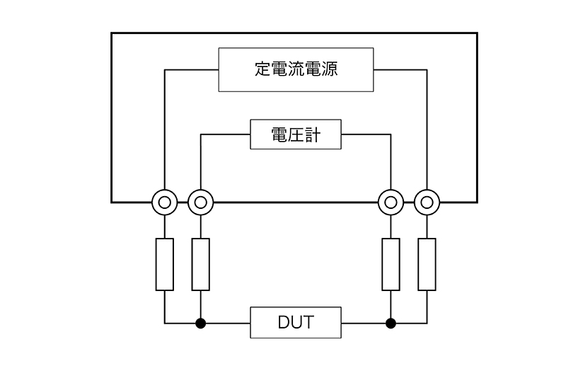 抵抗率の測定方法は材料によって異なります。金属箔や半導体ウェハなど、低抵抗から中抵抗(数 µΩ⋅m~100 MΩ⋅m程度)の材料では、接触抵抗やケーブル抵抗による誤差を排除できる四端子測定法(定電流法)と呼ばれる測定方法が用いられます。この方法では、あらかじめプローブ間隔が固定された四探針プローブを使用して測定を行うことから、四探針測定法と呼ばれることがあります。 一方、絶縁材料などの高抵抗(100 MΩ⋅m以上)の材料では、電圧計への漏れ電流による誤差を排除するため、二端子測定法(定電圧法)による測定方法が一般的に用いられます。