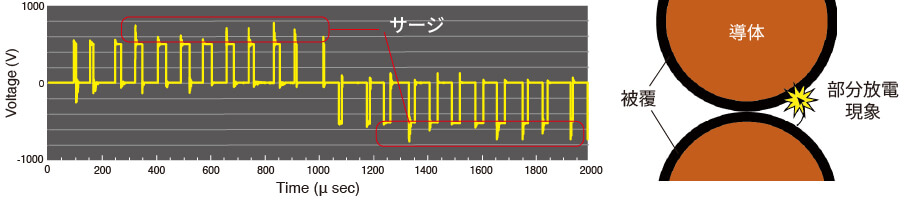 しかし、インバーターの高速なスイッチング制御は、モーターに電気的な負荷をかけ、劣化を進行させるおそれがあります。図1に示すようにインバーターの高速なスイッチング動作によってサージが発生します。また、このインバーターサージは、インバーター駆動電圧の約2倍の電圧に達することもあります。モーター巻線間に高電圧が瞬間的に加わり、ある電圧を超えると巻線被覆表面で放電が発生します。これを部分放電と呼びます。
