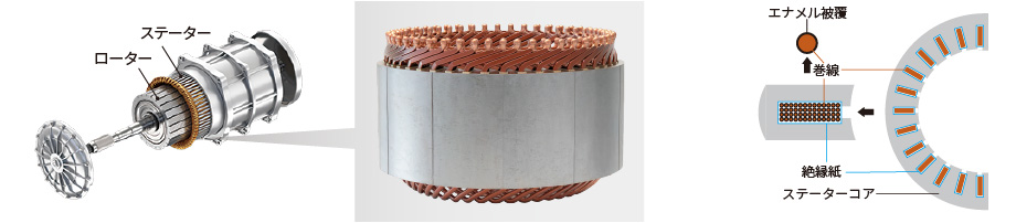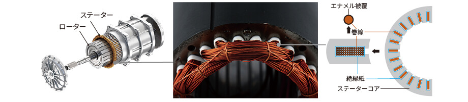 図2に示すように、インバーター駆動モーターの基本要素にはローター(回転子)とステーター(固定子)があります。ステーターは、ステーターコアに巻線が挿入され成形されます。巻線の導体はエナメル被覆で覆われて、線同士は絶縁されています。モーター生産の段階で何ターンか巻いた導体は、絶縁紙によってステーターコアと絶縁されます。製造過程での絶縁紙のズレや破れ、皮膜の破れや潰れによる線同士の接触、更に巻線とステーターコアとの接触などにより、絶縁性が低下してしまい、部分放電が起きる要因となります。絶縁層内のボイド(絶縁物質が局所的に気泡や不純物などで欠落した部位)や導体についたキズも部分放電が起きる要因として考えられます。