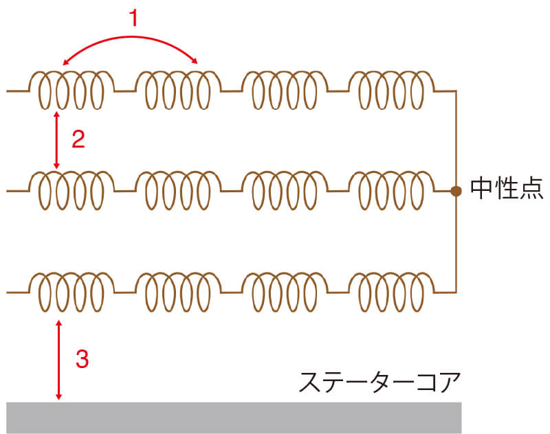 - 3.線とステーターコア間での触れにより放電(Phase to Core)