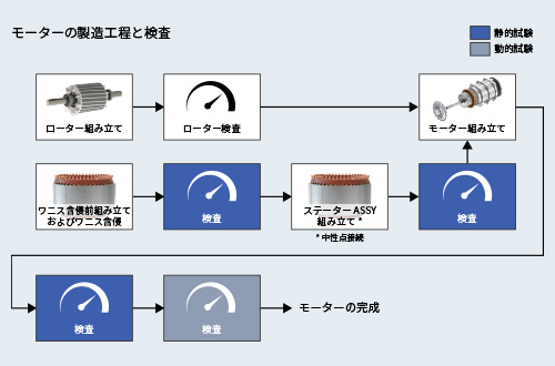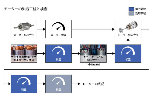 従来のインバーター駆動モーターの製造ラインでは電気的な劣化要因を検出するために、絶縁抵抗試験、耐電圧試験、インパルス試験(レイヤーショート/レアショート試験)などを行ってきました。耐電圧試験やインパルス試験は絶縁破壊がすでに起きている不良品を発見することはできますが、絶縁破壊に至る前の軽微な絶縁不良による微弱な放電を検出することはできません。そのため、従来の試験に加えて高精度な放電検出性能を持つ部分放電検出器が必要です。部分放電試験により絶縁破壊に至る前の潜在不良を検出することで、モーターの品質と信頼性のさらなる向上が図れます。