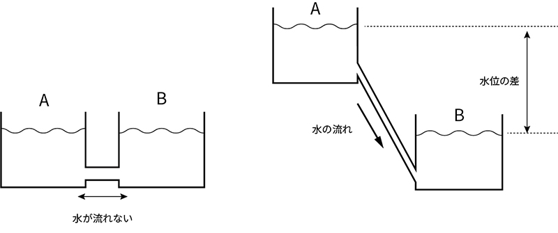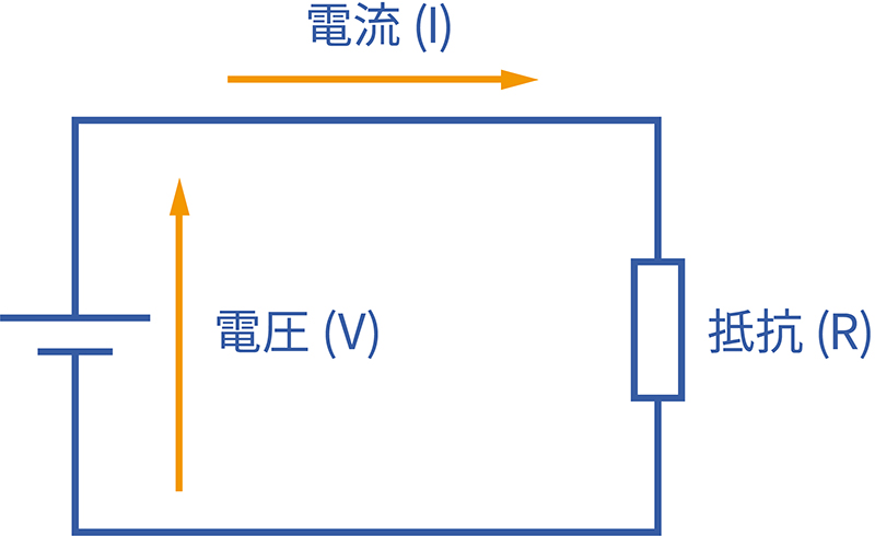 2つの端子間に電位差が生じると、電気は高いほうから低いほうへと流れていきます。この電流を妨げるものが抵抗です。抵抗が大きいと、電流は小さくなります。そして、逆に抵抗が小さいと電流は大きくなるのです。