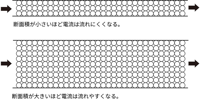 さらに、電気の流れる距離が長くなるほど電気抵抗は大きくなるのが特徴です。その他にも、流れる物質の断面積が大きいほうが、電気が通りやすくなるため抵抗が小さくなり、断面積が小さいと抵抗が大きくなります。
