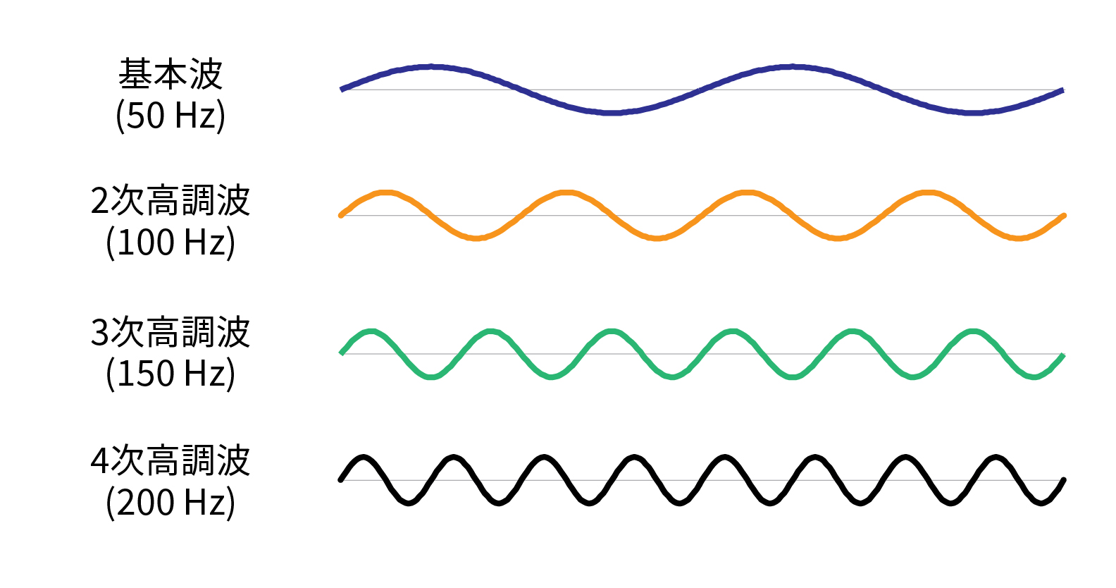例えば、基本周波数が50Hzの場合、2次は100Hz、3次は150Hz、4次は200Hzになります。