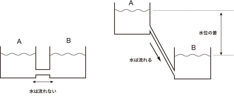 電気とは、電流として流れているものです。イメージとしては、川などの水の流れを想像してください。川の水の流れは、上流の山から下流の海に向かって流れていきます。つまり、水位の高い場所から水位の低い場所へと流れていくのです。電気も同様であり、水でいう水位に該当するものを「電位」と呼び、電気は電位の高い場所から電位の低い場所へ電流として流れていきます。