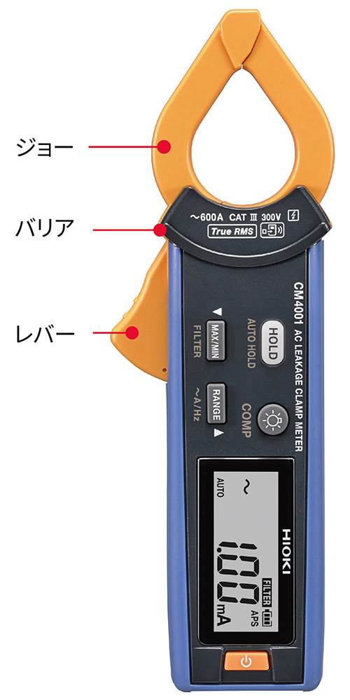 クランプメーターは、電線を切断する必要がないので安全性の高いものですが、対地間最大定格電圧以下の電路で使用しましょう。また、クランプメーターのバリアは、安全の限界を示すものとなるため、使用中はバリアから先のジョー側を触らないでください。