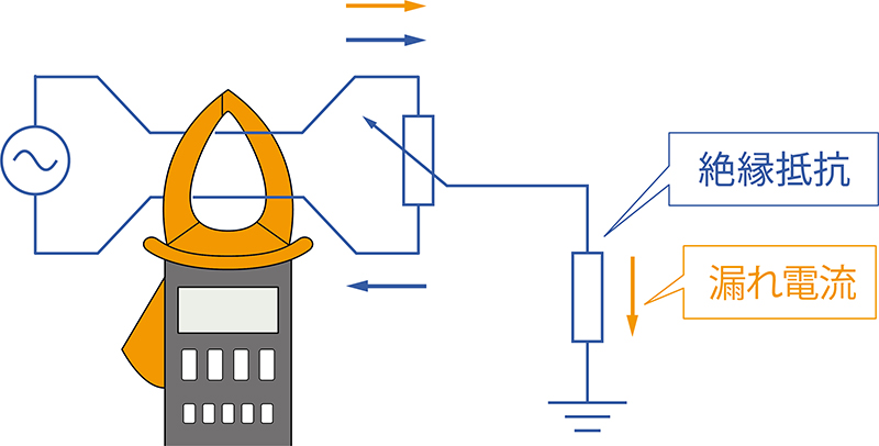 漏れ電流用のクランプメーターを使用して往復の2線をはさみ込むことで、往復の微小な差分を検出し、漏れ電流として測定できます。