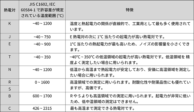 測定範囲と精度: 温度のみを測定する場合、まず考慮すべきは測定範囲と必要な確度です。これに基づいて適切なセンサーを選択します。一般的に使用される温度センサーには熱電対と測温抵抗体があります。これらは異なる温度範囲と許容差の特性を持っています。また、熱電対を選択する場合、K型、J型、E型、T型など、測定対象の特性に応じた種類を選択することが重要です。それぞれの熱電対は異なる温度範囲と応答性を持っています。