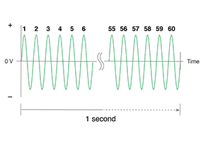 周波数(Hz)とは、交流の電気において、1秒間の間にプラスとマイナスが交互に入れ替わる回数のことをいいます。例えば、30Hzでは1秒間に波が30回あることを意味し、60Hzでは1秒間に波が60回あることを意味します。60Hzのほうが、波はプラスとマイナスをより早く入れ替わっているといえるでしょう。