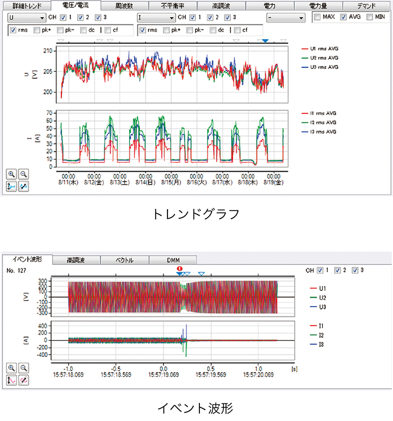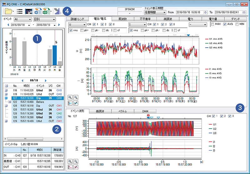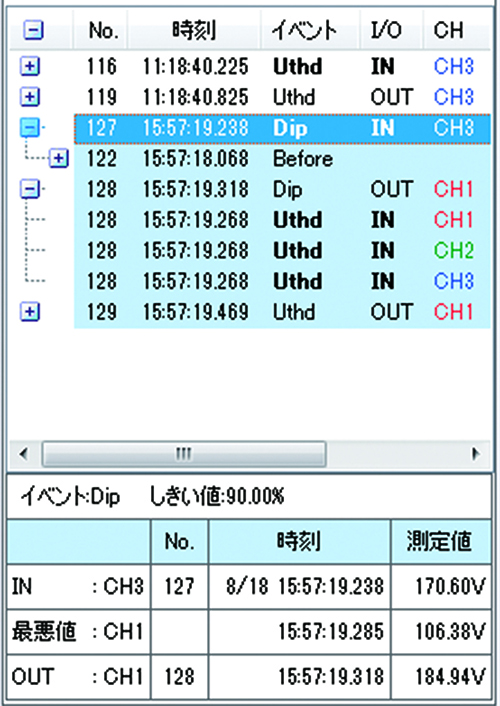 - トレンドグラフは、測定の全体像を示します。トレンドグラフは、異常の発見を容易にします。イベント詳細は、測定中に発生した電源品質イベントの詳細情報を表示されます。イベントの大きさ、時間、長さ、波形の形状などの詳細が表示されます。これらのデータを解析することで、電源品質問題の手がかりを見つけることができます。
