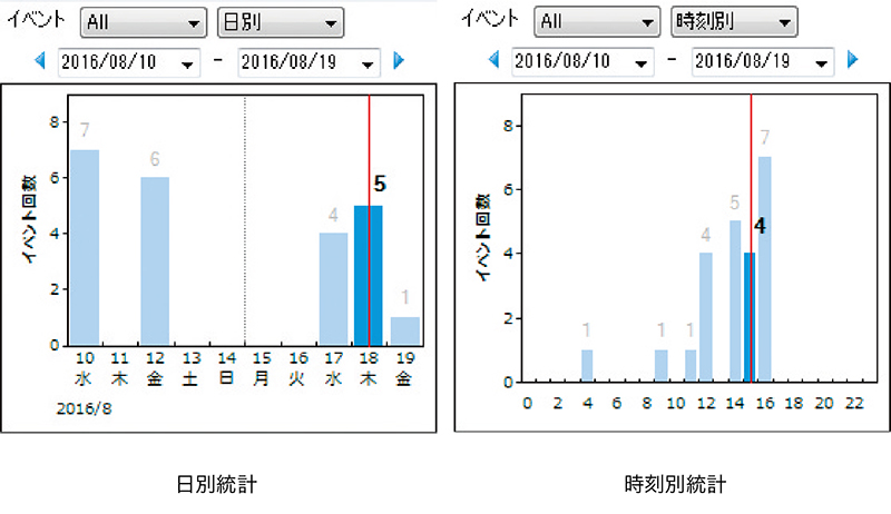 - 日付または時間によるイベント統計を表示します。この機能により、特定の時間帯や曜日に発生した異常を簡単に発見することができます。また、特定の曜日に発生した異常も簡単に検出できます。