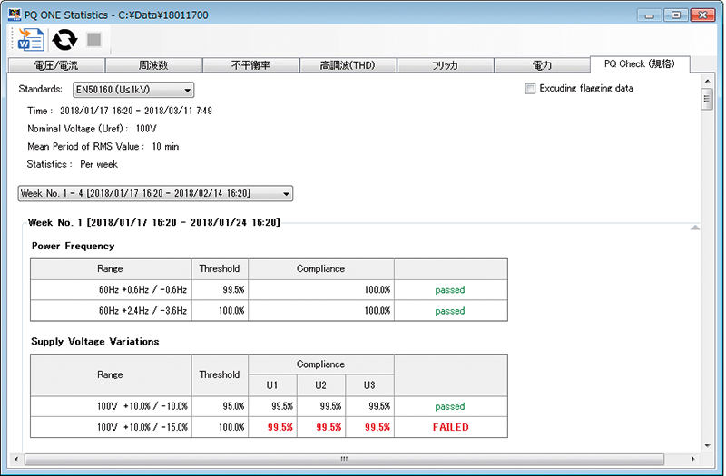 - 測定データを解析し、トレンド部の電圧変動からEN50160規格に適合しているかどうかを判定する機能です。基本的には電源品質の良否を判定します。