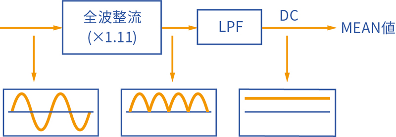 「平均値整流方式」では、入力波形を正弦波として扱い、換算をして測定結果を表示します。 この場合、波形がゆがんでしまうと測定誤差が大きくなる傾向があるので注意が必要です。一方、「真の実効値方式」では、高調波成分などを含んだ波形を換算して表示するため、より測定誤差の少ない数値を表示できます。