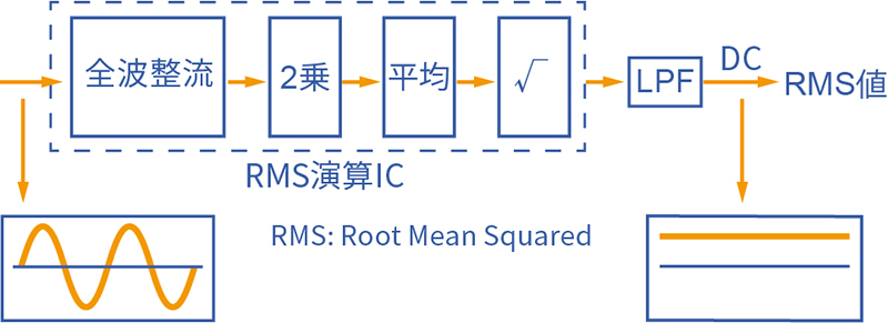 真の実効値方式とは、高調波成分を含む波形を2乗平均平方根の計算式で求めて表示します。