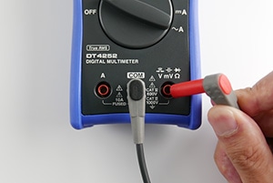 黒のテストリードをデジタルマルチメーターの COM 端子に挿入します。また、赤のテストリードを「V」および「mV」というラベルの付いた端子に挿入します。正確な測定を行うために、測定前にゼロ調整を行うことをお勧めします。