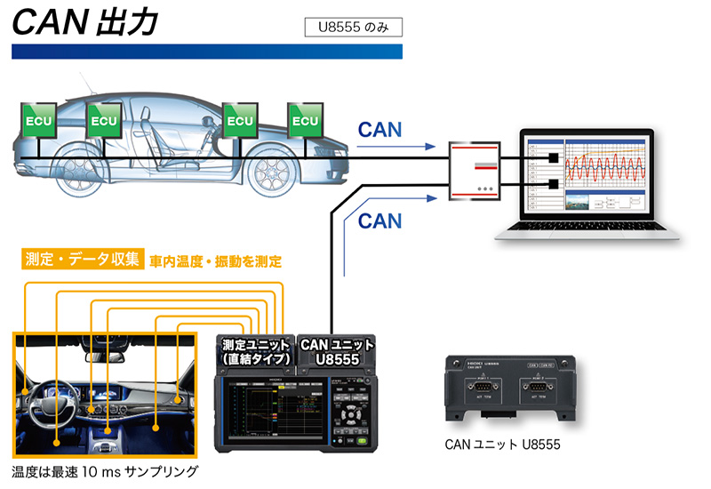 - 既存システム上のCANデータへのアナログ データの統合: HIOKI データロガー「LR8450及び、CANユニット」は、計測したアナログデータをCAN信号として出力し、このデータをCANバスおよび既存システム上の情報に統合することで、一元管理を可能にします。