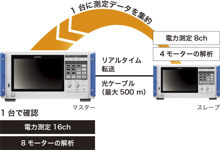 さらに、電力測定の大規模化や複雑化に応えるため、2台のPW8001を光ケーブルで接続して、最大16チャネルの連結測定を可能としました。2台連結により、測定データを1台のPW8001にリアルタイムで集約します。これにより16チャネル分の表示、解析、記録が一元管理できます(オプション機能「光リンクインターフェイス」*2、発注時指定)。