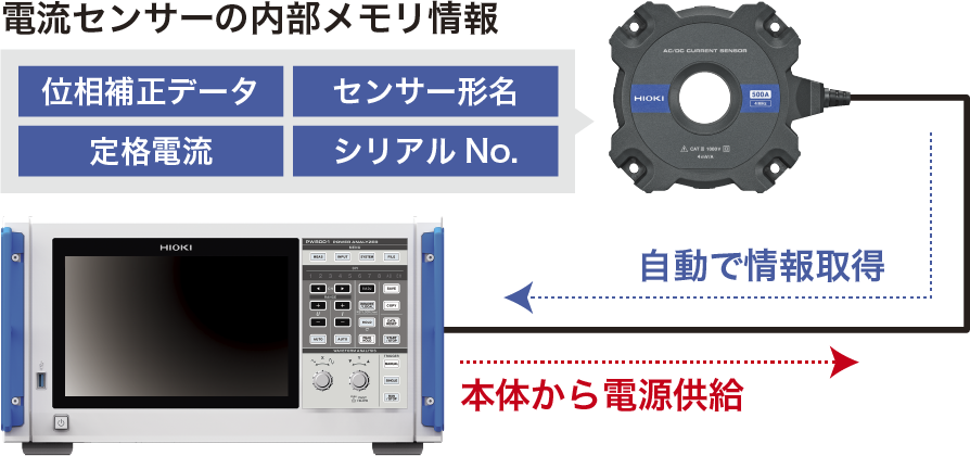 インバーターの電力測定や高周波リアクトル、トランスの損失測定では、正確に測定するために、電流センサーの位相誤差を補正して測定する方法が有効です。しかし、位相補正を都度適切に設定することは、測定準備の増加や設定ミスを引き起こします。PW8001は、対応する電流センサーを接続するだけで、適切な位相を自動補正する「新・電流センサーインターフェイス」を搭載しました。測定準備に手間をかけず、電流センサーの性能を最大限引き出します。