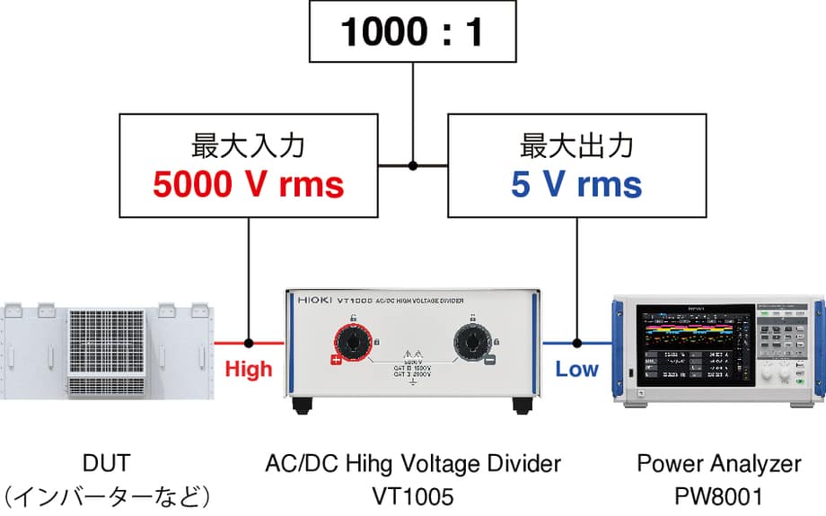 - VT1005は、最大5000Vの電圧を分圧し、パワーアナライザーへ出力します。