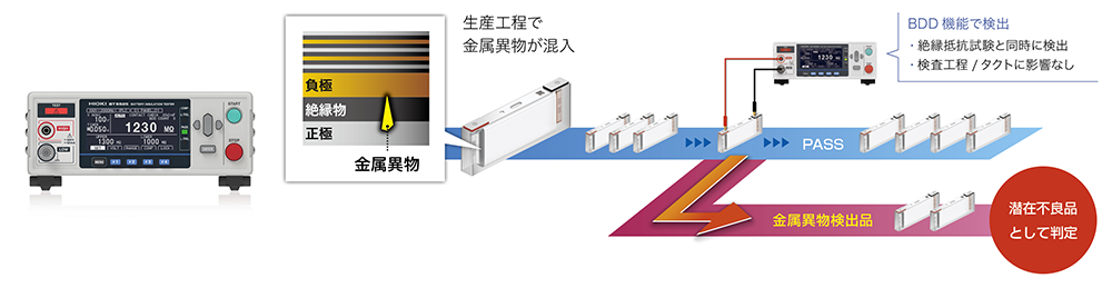 絶縁抵抗試験は、絶縁抵抗(電流の流れにくさ)を確認する試験です。測定対象に直流電圧を印加し、絶縁抵抗の数値を確認します。生産ラインにおいてバッテリーセルに損傷や作業工程ミスがあると絶縁抵抗が低くなり、検査で不良品としてはじかれます。しかし、生産過程において金属異物(電極の切れ端のような小さな混入物)が生じた場合、その場では絶縁抵抗が低くならず、検出できないことがあります。検出できなかった混入物は潜在不良となり、完成したバッテリーが長期間使用される間に劣化や内部短絡を引き起こし、最悪の場合火災につながる危険性があります。絶縁抵抗試験器BT5525は、バッテリーセル生産ラインにおいて確実かつ高速に絶縁抵抗計測を行い、潜在不良を検出することでLIBの安全性向上・品質担保に貢献します。