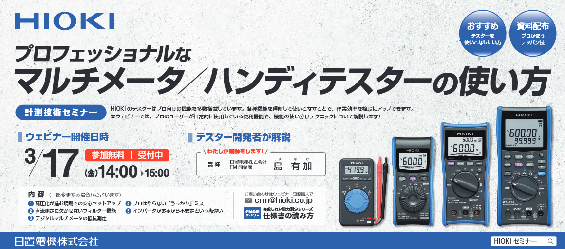 日置電機株式会社(HIOKI)は、お客様の計測技術の向上を目的としたセミナーを定期的に開催しております。 新企画「現場第一主義」はマルチメータ(テスタ)やクランプテスタといったプロユースの現場製品を深掘りする新シリーズです。