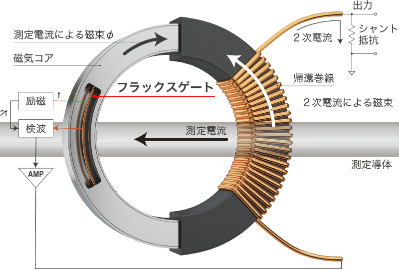 DC電流が測定できる電流センサーは、温度特性が課題となります。CT6840Aシリーズは、「フラックスゲート」を使用した検出方式を採用しています。一般的なホール素子を使用した検出方式と異なり、温度変化に強く、様々な試験環境で正確に電流を測定できます