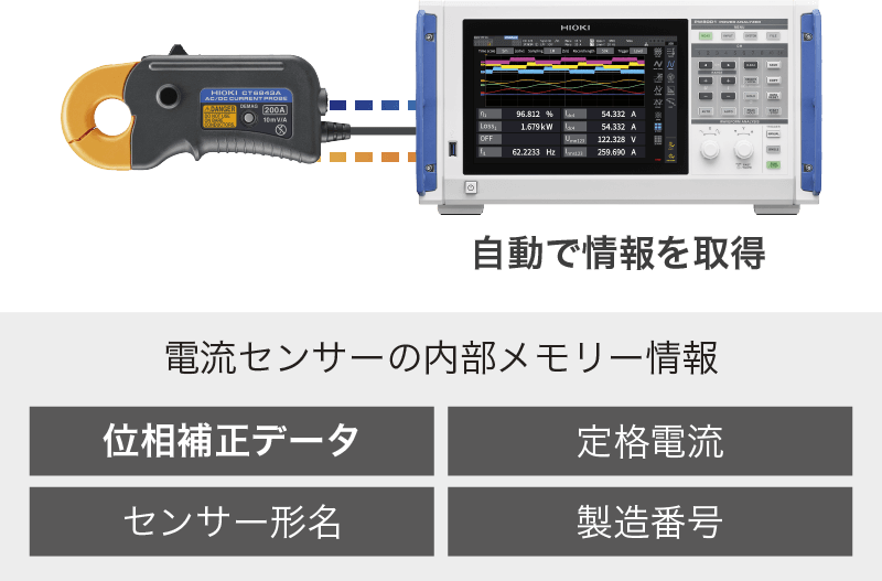 (すべての電流センサーには、位相特性があり、正確に電力を測定するためにパワーアナライザーで位相補正を行います。)
